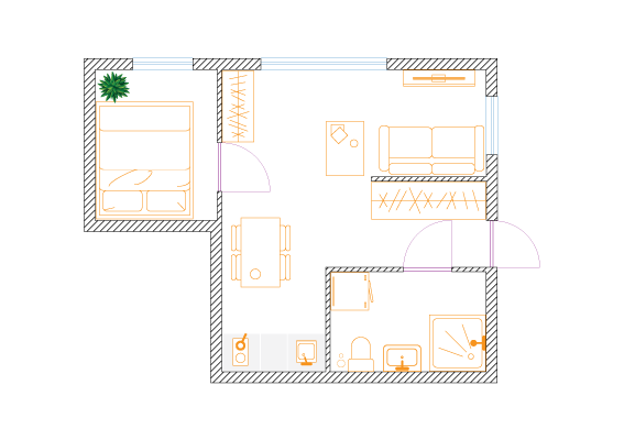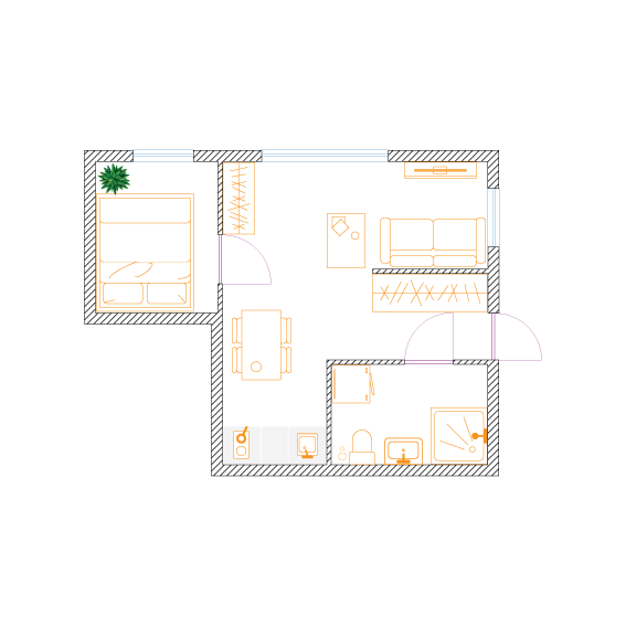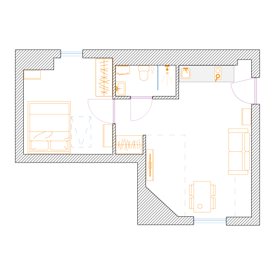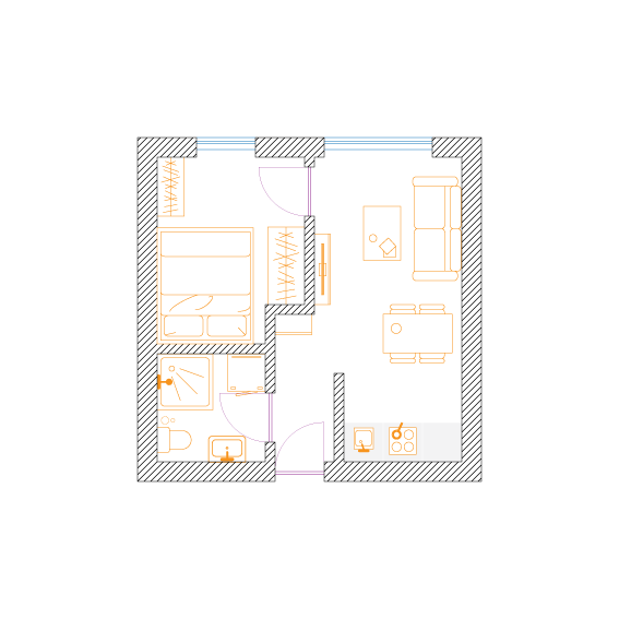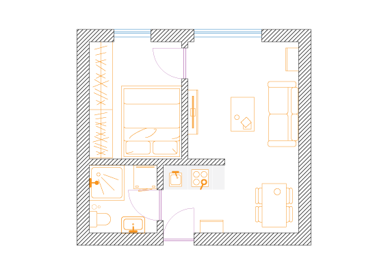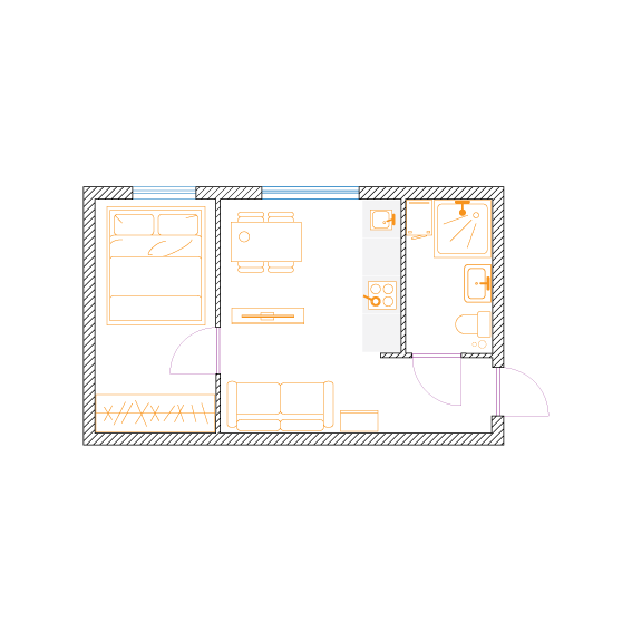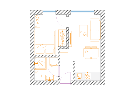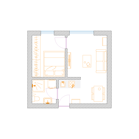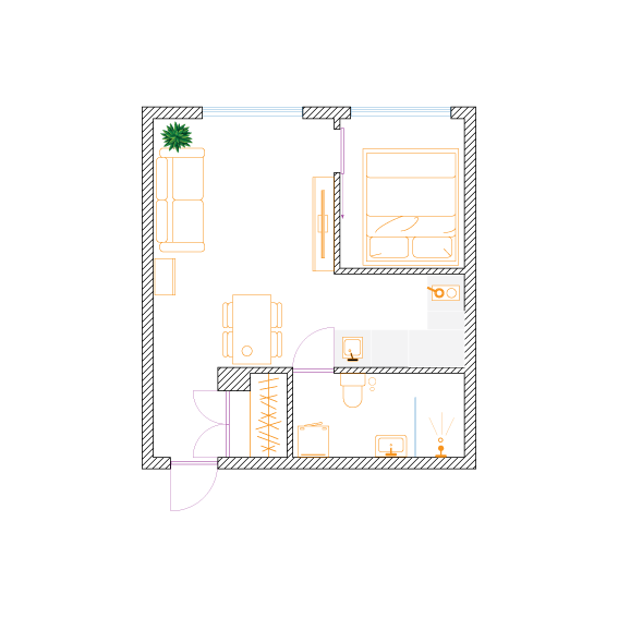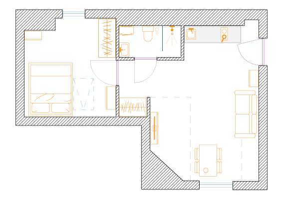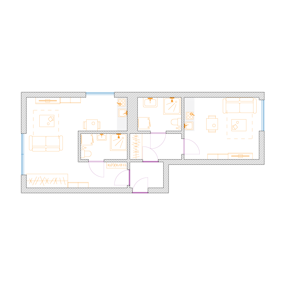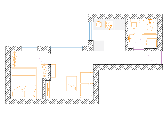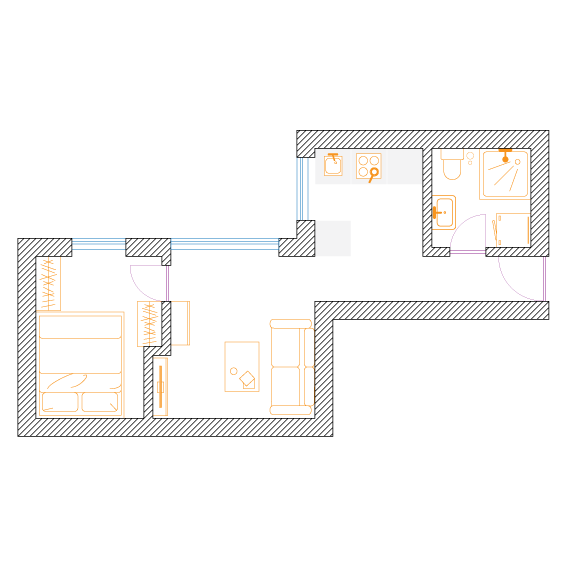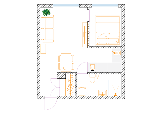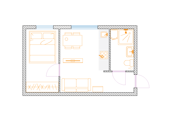 W celu maksymalizacji zysku z wynajmu właściciel dwupokojowego mieszkania o powierzchni 56m2 zdecydował na podział na dwie kawalerki. Założeniem było zachowanie funkcjonalności i najmniejsza utrata przestrzeni na część wspólną.