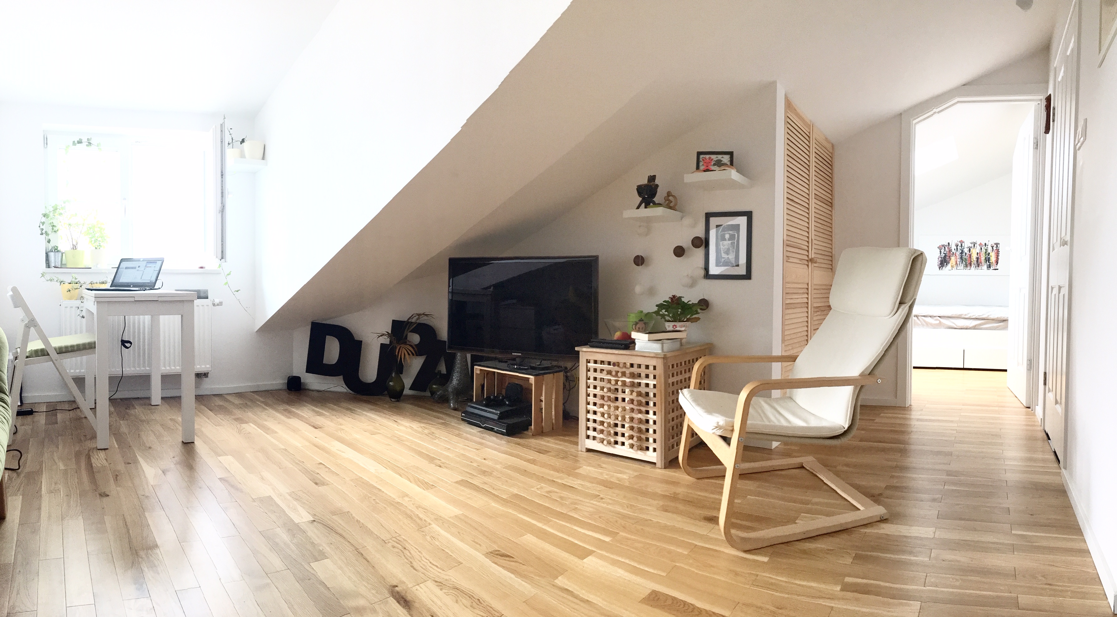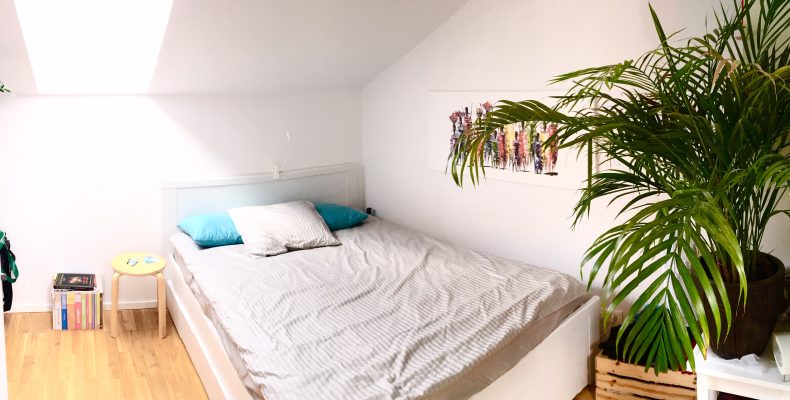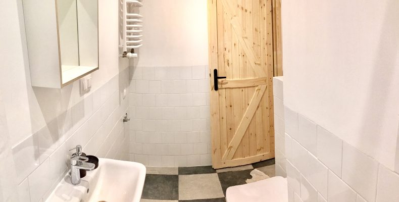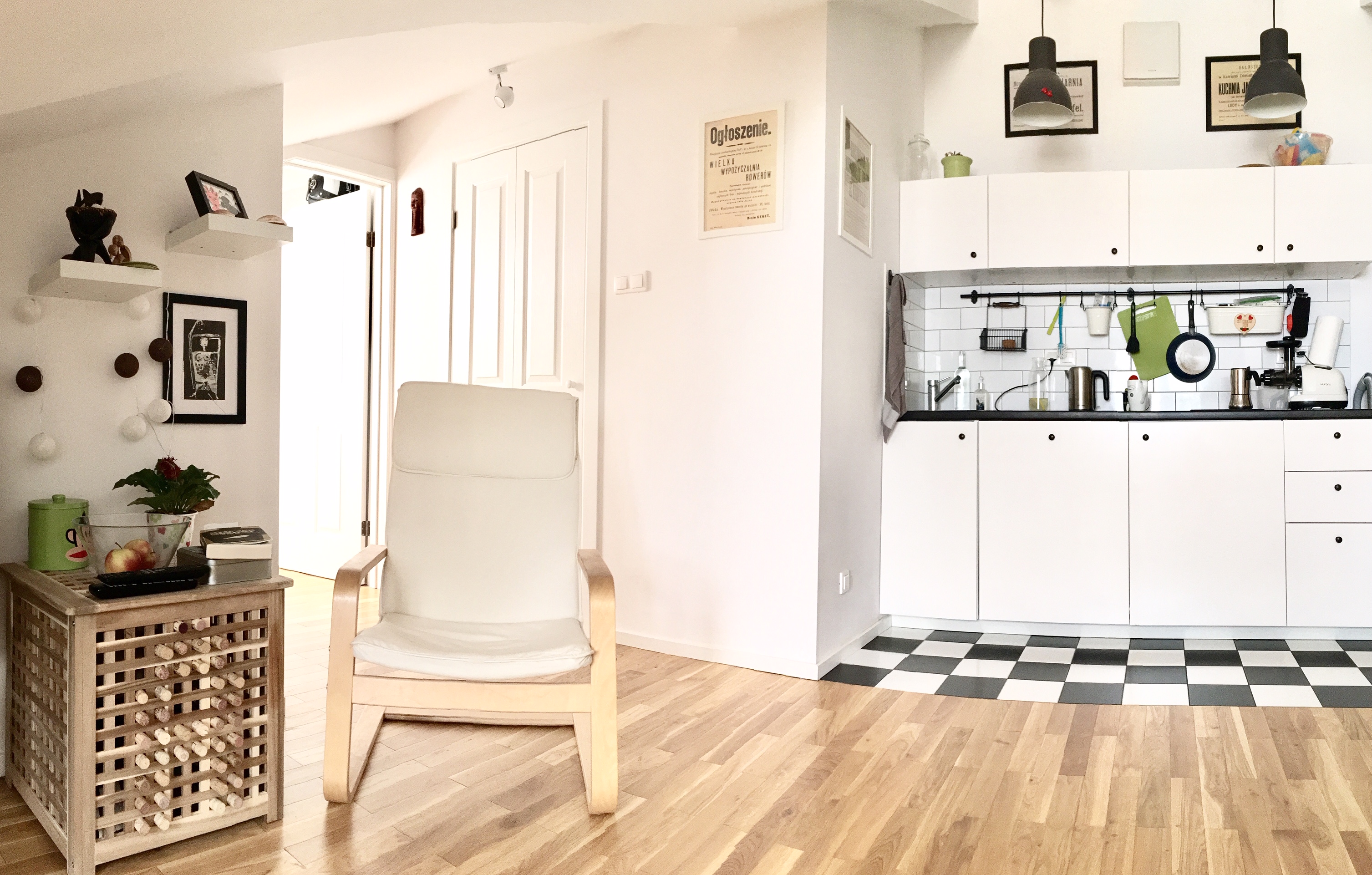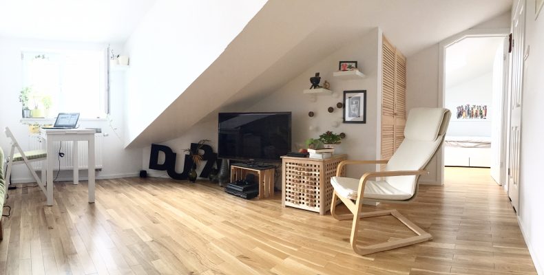 Mieszkanie znajduje się na poddaszu zabytkowej kamienicy z XIX wieku i ma powierzchnię użytkową 26.4m2, natomiast powierzchnię liczoną po podłodze 33.5m2. Udało się stworzyć przytulne, dwupokojowe mieszkanie na małej powierzchni.